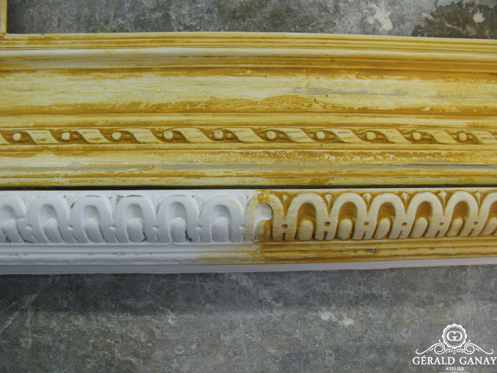 La colla giallo o ingiallimento comprende fondi tinta reparures con una miscela di colla in base forte e giallo ocra per superare i difetti di recupero di lamina di oro causata inevitabilmente dalla inaccessibilità di alcuni angoli rilievo scolpito.